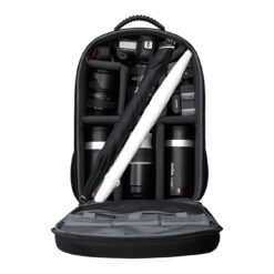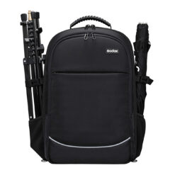 The Godox CB20 Backpack is designed to accommodate two AD200, AD200Pro, AD300Pro, or AD400Pro strobe units, complete with batteries, chargers, wireless remotes, and compact umbrellas, creating a fully portable lighting setup. The backpack also has space for a camera with lenses, and it features a lined pocket that can hold a 15″ laptop or tablet.